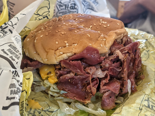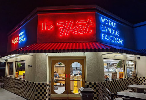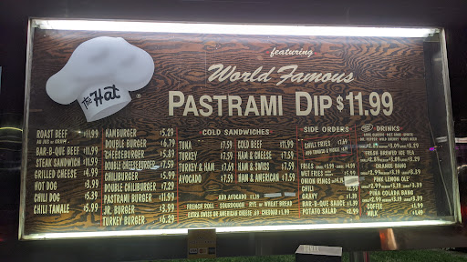 The hat. So good, so unhealthy. The best pastrami to be had from a chain. The chili cheese fries are the best ive ever had. And will be enough for four people. This particular place is never crowded...which is odd. Ive been to several The Hats in LA and Pasadena and theyre always crazy busy with it being impossible to even find parking. Here, theres always parking.