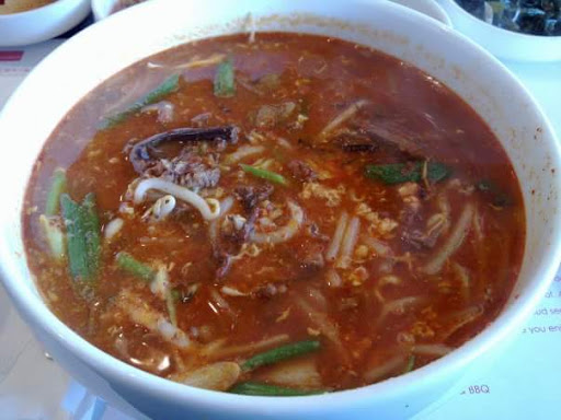 "Until Dae Bak here, baby Miss you, want you, eat you so Until Dae Bak here, baby, yeah Theres a hunger inside I want you to know You are the one And I cant let you go." - Dae Bak parody of "Back Here", BB Mak Shoutout to my buddy & fellow Korean, Chris C, for this little gem. Okay, so technically Im not Korean, but with all the Korean food that I eat, I consider myself an honorary Korean. Of course, I also consider myself an honorary Chinese, honorary Japanese, honorary Lebanese etc. ;p Lunch specials are inexpensive and quite reasonable. I decided upon the spicy beef soup ($6.99)- Preparation H & Tucks Medicated Pads must be hot commodities in Korea, because everyone must have burning bungholes from all the spicy Korean foods ;p A large bowl of tender shredded beef, egg, green onions with glass noodles swimming in a fiery broth. The broth didnt numb the mouth, which is good because I like tasting my food, but caused sweat to bead all around my big dome. My eyes teared, my nose ran & I needed a couple napkins to wipe the perspiration from my face. The soup warmed me from head to toe. Delicious, filling and for not a lot of scratch! Unlimited banchan & rice came with my order. Only 4 banchan options, but they were good Seating is plentiful, with tables in the middle & booths around the perimeter. A chandelier hanging from the ceiling adds a touch of class to this casual restaurant. A flatscreen TV with Korean QVC was on for diners viewing pleasure. I was close to ordering some womens spanks, but couldnt make out the toll free number ;p The wood paneling facade on the walls makes the restaurant seem cylindrical in shape. Service was good, although even though I was the only one dining there at the time, the wait seemed a bit long. Parking is in private lot in a Korean strip mall, with a few dedicated parking stalls at the entrance. Looking for another lunch spot? Dae Bak, baby!. Affordable lunch options of delicious Korean food, closeby to home, are why Im a fan. Lets do lunch! Highly recommend! NOMNOMNOMNOMNOMNOMNOMNOMNOMOMNOMNOM