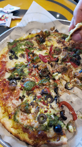 Great pizza quick as long as you dont go crazy on the toppings. They will keep piling it on and if its too much it will be soggy. The quality seems to depend a lot on the skills of the person cooking in their oven. We have has some great some so-so depending on how well it was cooked (same ingredients both times)! Overall a nice place to eat tasty pizza with better than average quality toppings. It is quite loud inside when its busy.
