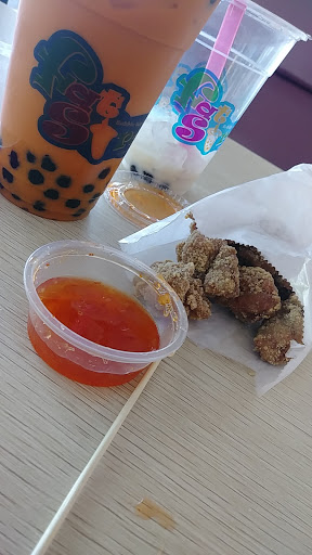 The popcorn chicken here is legit! Its not the stuff youre thinking of like other fast food popcorn chicken. Its is very meaty and filling, and only has a light layer of breading that doesnt compose half the mass of the food like other popcorn chicken. The milk tea is tasty as well and comes sealed air tight from the machine. This is the only place Ive seen this. Its really nice for not spilling until youre ready to sit and eat.