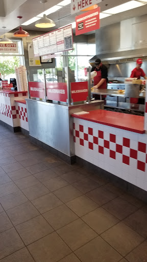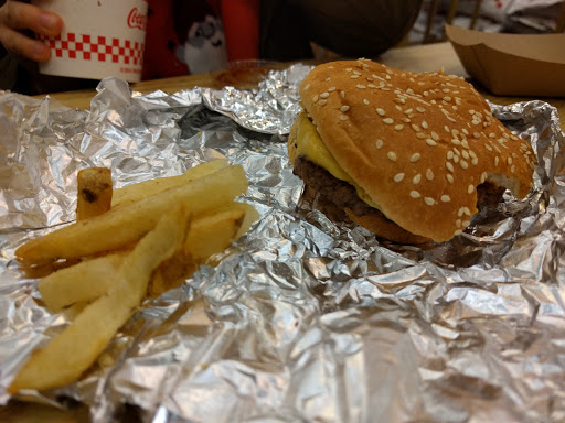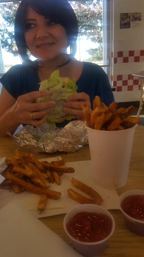 It was our first time to eat at five guys...we ordered hamburgers and fries. When our order came they were small not knowing that the order taker charged us for lil burgers. For the small burgers it was $4.99 each not worth the price! Burger patties were tasteless and fries were thick and soggy.