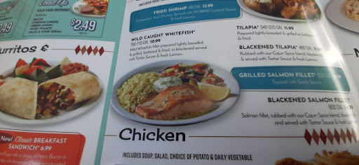 My first time eating here and my last. Took my 2 kids and I and was poor. Ordered the New York and scampi...the gurl started walking away without asking about my sides or town I wanted the steak. Then she brings my kids fish and we ordered grilled not fried. Had to take it back. Their cottage cheese tasted expired. She brought my soup n salad and before I finished my soup and has not touched my said she brought me steak out. Which I asked her to put under the heat lamp until I finished . The steak was tough, scampi was sad. I liked the green beans and the salad and soup. Poor service poor food. I was disappointed and sadly I will not be there again. Not at this location and not for dinner at least. I give it