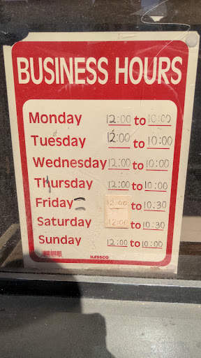 | Working: | 11:30AM–9:30PM 11:30AM–9:30PM 11:30AM–9:30PM 11:30AM–9:30PM 11:30AM–10:30PM 11:30AM–10:30PM 3–9:30PM |