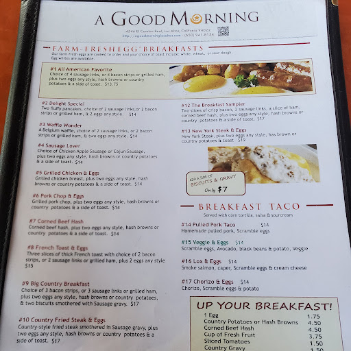 A Good Morning is a no-frills brunch spot in Mountain View / Los Altos. The decor is limited, but its not a big deal. The staff is friendly, though they can get a little bit bogged down when it gets crowded (and it usually does during the weekend brunch rush). Good breakfast and lunch choices, but all of their many Egg Benedicts are superb... Outstanding taste, and a very good value. As long as you can snag a seat, you will enjoy this nice little breakfast spot