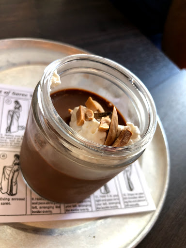 I had dinner Saturday night here with my wife. The food is a delectable take on Punjabi staples with LA flair. We tried the chicken tikka samosas and Punjabi fish for appetizers- both fantastic. I had the cutting chai, served in a handle reminiscent of Mumbai streets. It tasted great but not very authentic. My wife had mango lassi which was OK, not great. We then ordered badass chicken tikka and salmon tikka with Rosemary Naan (Great) and Tandoori Roti (OK) which both tasted just right. We only wished the portions werent so scanty. Chocolate chai creme de pot and mango mousse for dessert, which were both satisfying for what they were but I was hoping to try something more informed by Indian cuisine (granted though that desserts arent the strong suite of Indian food). The place had a lively vibe on the Saturday night with an old Bollywood movie projected on the wall, more as a mood setter than a distraction. The clientele was a cross-section of young urban LA. Our server was very helpful and engaging. We had a great time and will come back to try more menu items.