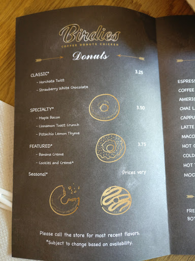 Reviewed on Facebook in April: Was in town for a few days staying with my cousin who lives a few blocks away. Walked down here for a late breakfast and IT WAS AWESOME. Very friendly staff that made sure we knew we could sample all of the donuts and that everything was made in-house and fresh. Of course I had to get the Candied Bacon Maple donut, which was great. I also had the Spicy Birdie chicken sandwich that had a ton of flavor, was made fresh and definitely was spicy, but not overpowering. If I had to come up with something to criticize, it would be the drink choices. They had a bunch of coffee drinks (although Im not a coffee drinker), water, and three kinds of bottled soda. One person in our group, along with another in another group, asked if they had juice like apple or orange. However, the experience and food were awesome and when I come back, I will definitely make a stop at Birdies!