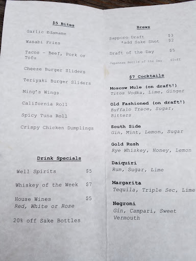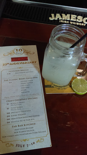 -Saturday Night review- You can almost missed the tiny entrance on 1st street here for the Far Bar. Look for alley entrance! Why is it call the Far Bar? Perhaps, its because of the long alley or is it because its filled with Hot Asians on Saturday night?! Who knew! What I love most about this place is their ambiance...outdoors with plenty of heat lamps and seatings! They also have romantic bulbs lined above you that sets the mood, can anyone say date on a quiet night? Back to Saturday, the DJ was slaying some awesome 90s music out tonight! Theres really no room to dance, but it was great to shimmy in my chair! As for food and drink, heres my take: Espresso Stout - If youre a Stout and Coffee lover, get it! Its really easy to drink, yum! Shiitake Burger-Juicy, will make to order! Extra $2 will get you fries. If you like their wasabi fries, ask them to drizzle the sauce! Im not a super fan of wasabi, so Im not crazy over it. Ketchup please? :) -Sunday Night Review- Whats best about Sunday besides the Happy Hour, its quiet and chill here! Not exactly happening, but I love that you can meet a friend here and simply catch up! Happy Hour Sunday/Monday all day Tues - fri 3-7pm $2 off Asahi, Kirin $1 off all beer (Including my favorite Espresso Stout) $2 off of liquor HH burgers M-W $5 burgers I would say the best night to come catch up with a friend is Monday with HH all day and a $5 steal with the burgers!
