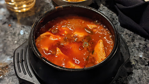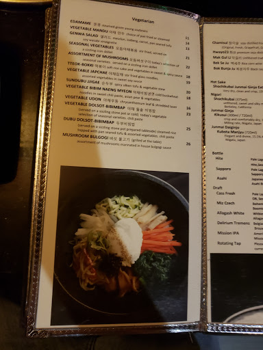Service, Ambiance, Value, Food, Ventilation - 5-stars all around! Value - 4 for dunner, 5 stars for Lunch -which I went to. When you first walk-in, the place looks so fancy that you feel your wallet throb. Then you open the menu...whew! Lunch Menu - WIN! But seriously folks, the dinner menu isnt inexpensive. If I had a Korean mother, Id probably opt for the lady (manager?) who was taking my orders and helping me grill my salvia-inducing bulgogi. Furthermore, the guy who switched off with her is welcome to join my inner circle of friends - what a nice guy! I was like, "Can I have some of that, salt and sesame oil thing?" Hes like, "Sure, I got you." Haha, thats cool. The lovely Rebecca W. ordered soondooboo jjigae which on the menu is called simply Soon-Tofu - spicy soft tofu stew. Its not really my bag but she thought it was purty darn tasty. And meanwhile my bulgogi bubbled and brimmed with special house sauce, cooking up delectably with some grilled onions. And oh yeah, count em 21 banchan.… They asked me which one I liked best...I mentioned 1 or two and they brought another few out. I coulda kept my banchan buffet going but, obvsly i was full after 21 frikkin Korean tapas. i heart seaweed. The complimentary cinnamon tea shots to conclude the meal capped off a perfect long-lunch. Bonus! - I went back to work without smelling like i just came from a cookout :) Genwa delivers delicious and authentic Korean cuisine in an elegant, and perhaps romantic, setting. Straight up.