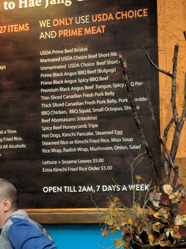 Hae Jang Chon has got to be my absolute favorite Korean restaurant in Los Angeles and even all of SoCal. Why? Let me count the ways: 1) This is a Korean BBQ restaurant you can take friends to and be proud of. This place looks hip, cool and young and the crowd is diverse. 2) The food is incredibly delicious...my mouth is watering right now as I recall the BBQ juices and the variety of meats, which brings me to 3) They have a wide variety of barbecue meat choices, including exotic stuff like squid, baby octopus and beef tongue. Of course they also have the standby favorites, black angus beef brisket, pork belly, etc. But they even include marinated short ribs in their all you can eat menu, and all for just $16.99. Talk about incredible value! 4) This is by far the IN place in all of Koreatown among restaurants and ayce korean bbq places. Its even open till 2AM! How can you go wrong? and finally, 5) The servers are friendly and extremely helpful...they come by often to clean up the stone grill with daikon radish, which is a spectacle to watch and very unique. All in all, this is my favorite hangout restaurant open late where me and my buds can get our ayce kbbq on. Awesome, truly awesome restaurant.