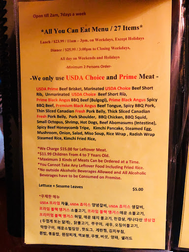 Ive gone to this place twice. Once with group of 3 and one with a group of 6. The small group was great but I love this place more with a large group of friends. If you have groups of 6 or more you can make reservations. I highly recommend this place for large groups. Instead of waiting an hour to be seated (which you will) you can call it in and they seat you writhing 5-10 minutes of your dinner reservation time. We had planned to do a la cart. One plate of their meat cost the price of an one all you can eat. Not thinking I ordered 6 plates of meat. After the guy takes me order he comes back in a few to tell me with that many plates of meat Im better offer getting the all you can eat because it will be cheaper overall and you get extra sides. That was really thoughtful of him to catch that and let me know so I could save some cash on dinner. I also really appreciate that they cook all the meat for you without asking. Especially with a large group its nice not having to worry about flipping the meat. They are also very diligent about asking if youd like more meat evan before you can ask. All the meat was fantastic quality for an ayce and I really enjoyed all their sauces and sides that cam with the meal. Good place! $23.99 a person for all you can eat.