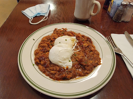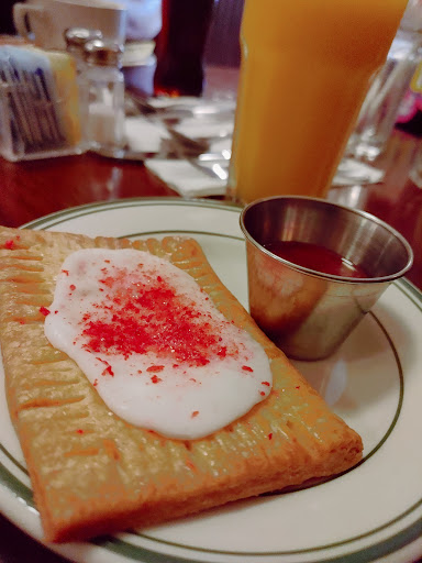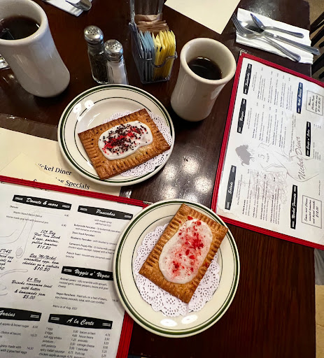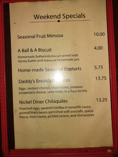 Yum!! After seeing Nickel Diner on Diners. Drive-Ins and Dives AGES ago, its always been on my list to try, I just never got around to trying it until now! We came on a Sunday afternoon around 2:30pm and there was still a 10-15 minute wait, which was fine with us. FOOD: - duck & cluck - mashed potatoes, sauteed greens, duck & bacon sausage and two DEEP FRIED poached eggs!! Those eggs were DELICIOUS and really made me wonder how they made them. Very filling and the owner said it was the best thing on their menu (but Im sure she says that about everything :P) - 5th & main - spicy bbq pork hash with two poached eggs on top. A TON of pork! Super delicious, not that spicy at all and perfectly poached eggs. Again, very filling. - homemade apple pop tart - they were sold out of donuts, and the pop tart was recommended to us by the owner and damn, Im glad we listened. The filling was super good, not full of that syrupy goo that can be found in apple pies. We ate it with their homemade strawberry jam - double yum! SERVICE: Friendly and quick! A good number of staff on hand, our food came out pretty darn quickly. It was nice to speak with the owner and see that shes around the diner :) VENUE/PARKING: Smallish, with booths, tables, and share-able high tops. We declined to sit at the high top tables and we snagged a nice cozy corner booth! Bathrooms are single stall per gender and clean. Parking was a bit more of a problem, we couldnt find any free meters, so we just parked in one of the lots nearby. Would definitely come back! Just not at peak times :)