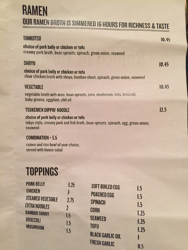 Second visit today. My first visit was dinner, lunch was today. Both visits were great although food timing took slightly longer for dinner. My first visit I had the Shoyu with chicken. It had a great flavor but I wasnt heavily impressed. For lunch today I had the Tonkotsu with chicken. The pork broth is defiantly more hardy than the clear chicken broth used in the Shoyu. If you have a health appetite I would order the side of noodles. Although when they arrive to the table it appears to be a small portion its a sufficient amount. You can also easily share if youre dining with someone. I never save receipts, and didnt catch his name but the guy who helped me both visits was great ! Oh !! And try the cucumber mint yuzunade. Its so refreshing !!