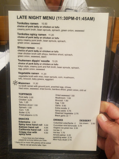 I like their ramen. Its hard to not have expectations when the yelp ratings are so high. One thing for sure, they have the best fatty chasu Ive had and the soup wasnt as heavy as expected (which is a good thing for me). Its so nice to leave a ramen place with a satisfied belly minus the fatty food coma. We showed up on Sunday for dinner and waited about 20-30minutes and the hostess had us share a table with 2 other strangers. Luckily our table mates were social and I really enjoyed talking to them about burning man :) I GOT: spicy tonkotsu (NOT tonKAtsu) ramen with a side of spicy sauce on the side. I would recommend the tsuke-men (you dip the noodle into the soup) to people who are craving for sweeter broth (Im guessing its bonito base). Gyoza was good, I dont mind ordering it again. PARKING: got lucky and found a spot nearby. Theres also street parking. SERVICE: was great, they were busy but attentive. We got complimentary green tea ice cream for sharing a table (?). As much as I enjoyed the ramen, I wont go out of my way to drive to Silverlake (30min) and wait 20-30minutes for it. If youre in the area then I would def recommend it when its not super busy. BATHROOM: stank