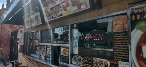 This place is a hit or miss. Sometimes the Fish tacos come out perfect and are big but other times they are overcook/burnt or the batter taste stale. There is a seating area but not the cleaning place.