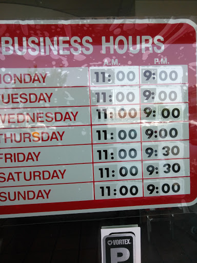 | Working: | 11AM–9PM 11AM–9PM 11AM–9PM 11AM–9PM 11AM–9:30PM 11AM–9:30PM 11AM–9PM |