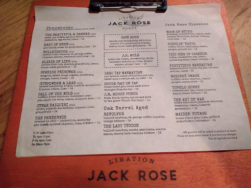 Weve been visiting Jack Rose at least once a month for the last few years now. Cant beat Jack Rose for a good bourbon cocktail. Their bartenders are world-class, literally having competed and won world bartender competitions. Our favorite drinks are the Jack Rose and the Tupelo Honey. Its a great location snugged in between Saratoga and Los Gatos. They have lots of outdoor seating on a large patio out front and a large tent out back. Both are full of heaters in case it gets cold. The inside is cool too, with couches in the corner, but a little hipster-ish sometimes. In the summer, they have live outdoor music on Friday nights. They also usually host a craft beer festival once a year toward the end of summer which is a lot of fun. Only 4 stars because of the service. The servers are always very nice but they are so slow.