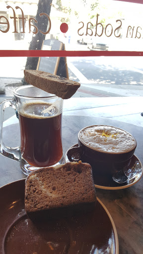 What a fun coffee house! Old school decor.Old fashioned coffee canisters line the tops of the shelves. The also serve slices of cakes. We ordered an ice coffee and sat down to enjoy a slice of chocolate cake (which was very rich)...the coffee was excellent. Inside, youll also find a relic of a large coffee roaster. Dark wood interior...but a great location within downtown Los Gatos. If I lived in this area this would be my go-to coffeehouse.