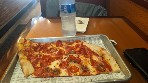 Great location of a bay area native franchise. The pizza is absolutely top-notch, and only $3.00-$4 per slice and they are HUGE. No alchohol sold at this location, and it has limited seating as the layout is very narrow, but they do have back patio seating. Leash holders outside with water for your doggies. Cool surfer themed decor and awards galore on the walls. Parking can be difficult, but there is a lot out back and an entrance there too.