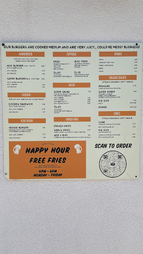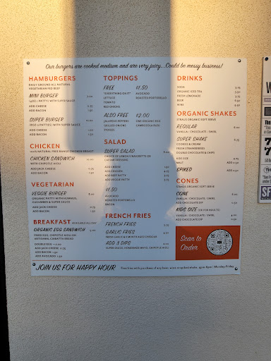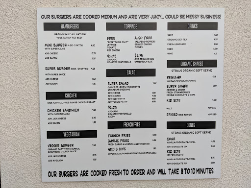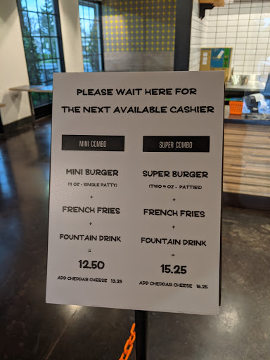 My first bite of the Super Burger was one of the best Ive had! Wow. Meaty, salty and fatty. I dont typically care for juice running over my hands, but the taste of this burger was so worth it. The ambiance is high ceiling industrial. Very clean. It was hard to find a table that didnt have a music speaker blaring right onto it. And this day there were a lot of kids running around making it very noisy. However, the burger was so delicious that Ill be going back soon.