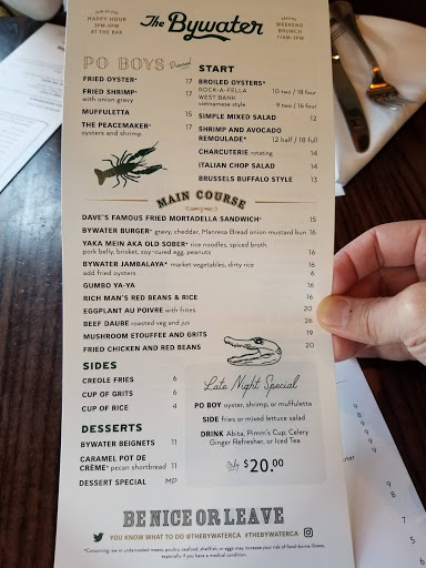 This is now the fourth time I have been here - and the fourth time I have been extremely disappointed. I should start by saying I dont like giving bad reviews, but The Bywater has unequivocally earned this one. Future patrons and Bywater staff, my explanation is below. To start - the food: Its OK. Not REALLY good, just good. The first and second times I visited The Bywater I was expecting something more gruff, something more New Orleans... They do not do that here- They do smaller, fancy dishes where you pay 26 dollars for five bites. Normally Im ok with this because the food quality matches the price... Except here it does not. If youre going to serve expensive food, especially when its based on casual New Orleans fare- it had better be tastier than the cheap stuff. The service: ...Its OK. Again, if youre going to pay that much for a meal, the service should match. The feel: Feels great, nice atmosphere, good design on menu etc. The drinks: Great. Always a good selection of cocktails and beers on tap. Overall: 2/5 Save yourself the money, and go someplace else. Really missing New Orleans? Well, for only a little bit more buy a ticket and go in-person.