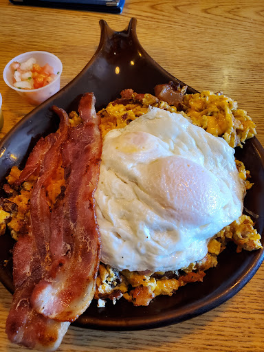 I was staying with my sister in Manteca and she suggested that we head out to the Mangy Moose for breakfast. I have to admit, I was intrigued by the name and they had hooked before I ever stepped in the door. When I did actually step in the door, I was blown away with the arrangement. It was very simple actually but I never see it in breakfast places anymore. The main part of the restaurant was at the counter in front of the cooks. There where a few tables around like two of them and then there was a back room with a few more tables and those look like they might have been an add on after the fact or something. It is very cool to plop down at the bar and engage with people sitting on either side of you as well as joining into the conversation with the different cooks behind the counter who are also right there talking with you. We dont need social media, we just need the Mangy Moose setup in all restaurants LOL! Ok so onto the food. I had the moose skillet it has bacon linguiça and ham scrambled with diced potatoes egg and cheese also served with two sausage links. I never had linguica before and from what I could tell it is some kind of foreign sausage. In my book it is more meat and that is A-OK! So this skillet comes out that is filled with yummy meat, eggs and potatoes and on top it has two more sausages. This plate was very tasty. I did hit it with a little tabasco and I was off to the races. I was not overly hungry on this day but I had a good appetite and I couldnt get through half of this skillet. The portions here are huge. I actually went with 3 other people and everybody asked for a to to box. If your in downtown Manteca, stop into the Mangy Moose.