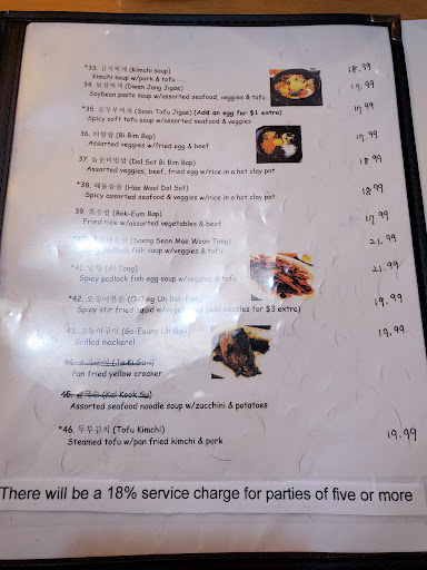 Despite the abundance of Korean places on the peninsula, none of them seem to be first, or even second, rate. This place comes as close as any. My wife and I went there for lunch and chose from their lunch specials. She had the kalbi and I had the Soon Doo Bu. Both dishes were seasoned well, but the Soon Doo Bu didnt come boiling in its bowl so that I could boil an egg in it. In fact, no egg came with the meal. We had only five Pan Chan (side dishes) to choose from, which isnt very much. On the way out, I noticed that customers who had Korean people in their party had been given more, including Oi (cucumber) Kimchee. Since this is one of my pet peeves, I gave the low rating on service. If I am back in the neighborhood, I might stop in again, but I will not seek the place out.