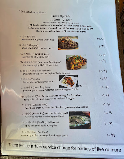 Lunch special every opened day!! Not so Americanized, authentic Korean food. Seasoned just right. It seems like number of side dishes depends on what you order. Side dishes are refilled free of charge like a Korean restaurant should be. I get headache with MSG but I never had one here with any dishes Ive tried so far. My favorite Kirean Restaurant in Monterey area! Dont miss out the good stuff!