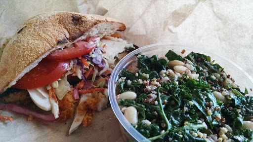High quality wraps and sandwiches full of wholesome goodness you believe at first bite. This is a chain that I like seeing when I see it. Sure, they have blue cows. But they also serve super tasting sodas and you can test their salads. I love their curry couscous salad, at times the oil can be much but in small doses its so comforting. Wine and beer served here. A few vegan options that are seasonal and always changing so you dont feel stuck to the same menu. My favorite thing has been the samosa dosa vegan wrap, it was full of Indian curried potatoes, cauliflower and peas. Please bring that back and Ill be back. Indoor and outdoor seating. Free parking.