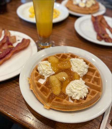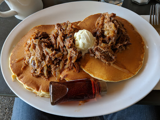 Had the Chorizo 3 egg scram.. Im partial to Chorizo but it was amazing. The pancakes are fluffy and the size of a plate. Very good atmosphere with great service. My girlfriend had the Apple Waffle and I had a bite, awesome. Go here.
