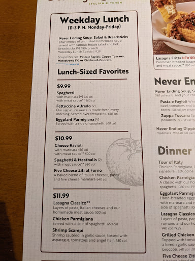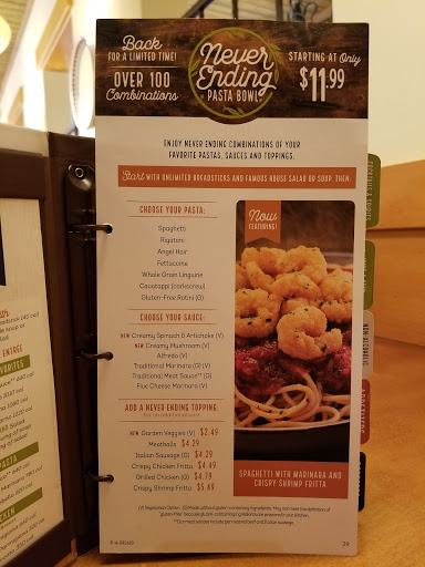 It took about 30 minutes to get our food after ordering. The order was only three adult meals and two kids meals. While we waited, we ate 3 bowls of soup. Two of the bowls were warm, at best. Our server left our food on the order table for quite some time apparently, because when the pasta came out, the pasta looked dry. By that time, we just wanted to eat and leave. Tue shrimp in the Shrimp Alfredo were much smaller than in the picture. The restaurant may need to add "shrimp appear larger than actually served" in the menu. Now I remember why we havent come to this Olive Garden for two years.