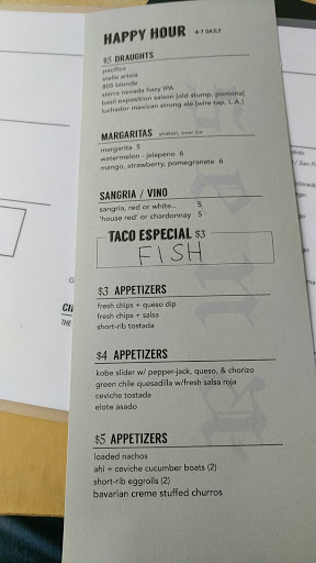 My friend and I came for happy hour yesterday. Lets just say, I cant wait to come back! Service was excellent and the food was delicious! What we ordered: - Taco of the Day: Pork Soft Tacos $3 each - Ceviche Tostada $3 - Green Chili Quesadilla $3 - Loaded Nachos with Short Rib $8 - White and Red Sangria with fresh fruit $4 each We really liked the Pork Soft Tacos!! I wished I just ordered more of that instead. The Ceviche Tostada was good but, I wished it was spicier. My friend LOVED the Green Chili Quesadilla but, she loves anything with cheese. Haha. I thought it was okay but probably will not get it again because there are so many better options. The Loaded Nachos were good but, I did not like the Short Rib. It was a bit too chewy due to the carnitas/pulled pork-like texture. I was picturing it to be like korean short ribs. The White and Red Sangria were delicious! Happy Hour is from 4PM-7PM EVERY DAY so make sure to stop by! You wont regret it! :)