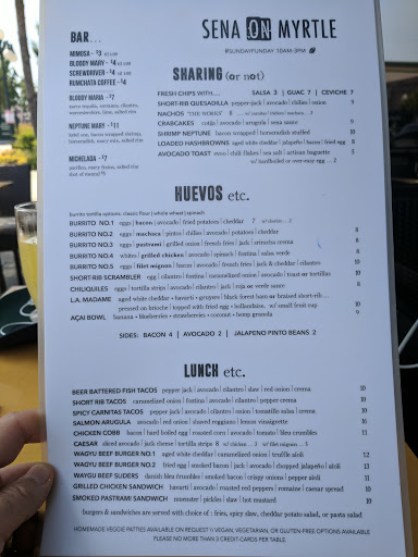 I have been hearing nothing but good things about Sena On Myrtle and was a bit disappointed by the selection. I think a part of it may have been because of the hype by everyone and I may have built too high of an expectancy. The drinks were very good and the service was excellent. I recommend the Burger and Fries.