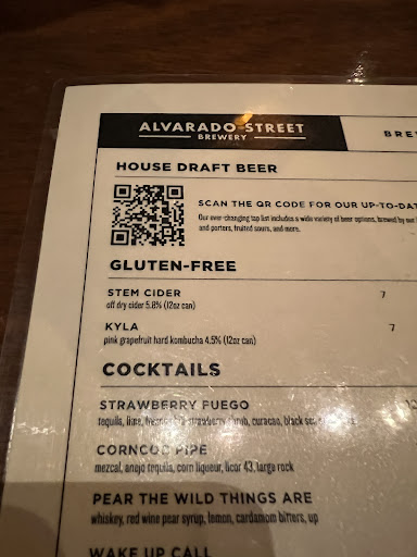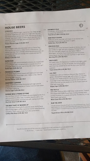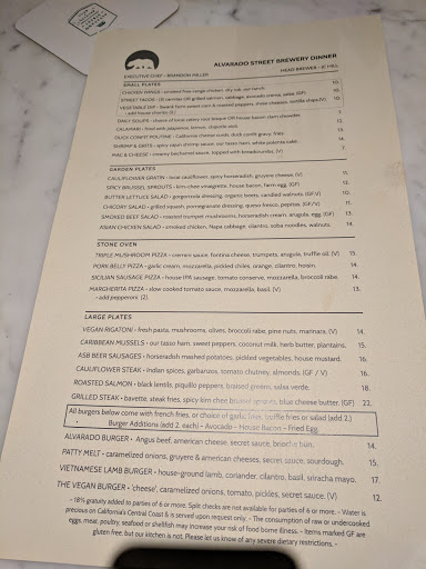 Summary(5/5): Excellent culinary establishment!! Highly recommended for visitors and locals alike. Craft beers brewed onsite are Awesome! Great staff and service. Environment engenders an open atmosphere for groups, families, and individuals. Brilliant addition to Old Monterey. Brewery(5/5): As a local Monterey IPA fan who has visited Russian River Brewery in Santa Rosa, CA. several times to fix my Pliny itch, we are gifted by getting a local establishment that delivers the goods and saves the drive. The Brewers offer a changing mix that has been tantalizing me for the past few months. I’m stopping by several times a week. Testimonial: I have been enjoying the Cindercone IPA from the recent batch (Feb-March 2015). They got something right here. Darker color and intentional smoky flavor. Amazing thing is that enjoying two beers after work, a bike ride home, and gleeful smile attending to mid-evening business, there are NO morning after-effects from consuming alcohol the previous night (I’m a lightweight, so I notice these things - the effects of two Pliny the Elders, or other IPAs, are still present in the morning). I’ve tried this Cindercone experiment on three separate evenings over 10 day span with the same NO morning residual effects. Its kinda weird. Seems like the Brewers have concocted a Happy Health Food! Go Brewers! Service(5/5): Courteous, helpful, and professional. Staff is selected to high standards. There is a general good vibe that staff present. Cooks smile while talking with coworkers (very important to have low stress around food preparation, and food presentation reflects this). Bussers take the time to straighten items in cabinets. Extra effort is noticeable throughout the establishment. Testimonial: Needed to spend several hours reviewing work for impending symposium. Server was open and helpful in allowing me to occupy table (with several beers of course) that provided positive atmosphere to complete the task. Owners/Mangers are commended for building what appears to be good morale with their staff (an unfortunate rarity these days). Food(4.7/5): Only lost twinkle on the star rating is need for more vegetarian offerings. This may be a bit premature as they are trying (47 is prime anyhow - yeah, I’m a nerd). What is on the menu is great. Pesto flatbread is excellent pizza substitute (and less cheese!). Grilled asparagus is delightful (sans bacon). Appeals have been made for veggie burger, which they are working on. Chef is to be commended for trying different veggie burger combinations (some of which I have had) but pulling them back until they get it right. Alvarado Street Brewery is an intelligent, artful, and thriving addition to Downtown Monterey. Recommended for an eclectic experience, or if you just wanna drink some GOOD beer!