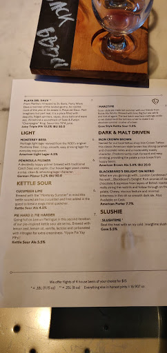 Best beer in town! Ive been to every restaurant in the Monterey area that offers an above average beer selection and THIS IS THE ONE! Not only do they brew their own beverages on site, making for a fresh and crisp compliment to EXCELLENT food, they are the only ones to offer such a VAST local selection of beverages! Service (5/5) - Every experience Ive had at ASB has been met with professional, courteous and very friendly (as well as personal) service! Ive visited 15+ times now, which is saying a lot considering they only opened up a few months ago. This can make for a small wait time if you want to be seated somewhere in particular but the bar is almost always open with text message wait service available! Food (5/5) - Ive had at least ten things off of the menu here and every single item has exceeded my expectations. My favorite is the Brewery Burger and the fries (original, I know) because it goes so well with the many incredible beers that are served here, freshly I might add, every night. The FLATBREADS are also an excellent choice and offer something for the whole table as an appetizer or can easily sate ones own hunger with many great flavors that can also be complimented with great tasting beer! Beverages/Beer (6/5!) - The ever-changing menu of beers is the highlight of this restaurant. Ive never gone out with less than three drinks under my belt and on all but one occasion where they were sold out (a testament to their quality) of all three top brews, I was beyond satisfied. The service is extremely knowledgeable as to what pairings are best with what foods and are more than happy to offer a sampler platter so you can get an idea as to what youd like to make your dining experience all it can be. IN COMPARISON: Peter Bs is a second, but not a close second by any means. It can be pricey for what is offered and doesnt offer the contemporary atmosphere or many qualities in which ASB tops them with (Service, selection, FOOD QUALITY). Cannery Row Brewing Company in comparison is an AWFUL CHOICE. Not only do they not brew any of their own beers *GASP* (how deceiving) but their quality of food and service are trumped ten times by both ASB and Peter Bs. The only redeeming quality (if you want to consider it one) of CRBC is its proximity to the tourist attractions. However, Alvarado Street Brewery is a gorgeous ten minute walk away regardless! Any and all that appreciate great food, atmosphere, EXCELLENT beer or all of the above would be VERY PLEASED with their choice in Alvarado Street Brewery.