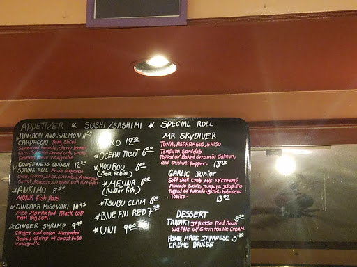 Awesome sushi, great attentive staff, nice atmosphere. I cant recommend Crystal Fish enough. We loved everything we ordered and wish wed been in town longer so we could have come back to try more things. You could tell the ingredients were super fresh and everything was served promptly so it was the perfect temperature. We showed up during prime time for dinner on a Saturday night so there was a bit of a wait but it was completely worth it. They have a simple list at the front that you sign in yourself and mark if you are looking for a table, willing to sit at the bar or either. Since there were just two of us it was easy to sit at the bar and we loved the experience of being so close to the chef making our sushi. Easy parking nearby, the metered spots were free after 6pm.