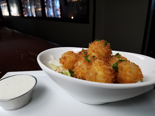 My boyfriend and I had dinner here on our anniversary for the first time and everything from the food to the service to the ambiance of the entire place was wonderful!! We work in the industry and definitely know good food when we see it. We could not have picked a better spot to celebrate. First off we were greeted by the General Manager himself who was very gracious and led us to our seats. We started with their version of a shrimp cocktail. The presentation was impressive to say the least. Four shrimp stacked atop a battered and fried yellow heirloom tomato with a spicy mayo sauce. For our entrees, I had the pan-fried artic char which was perfectly seasoned; with a chorizo pancake filled with onions, potatoes, and bell peppers, a roasted red pepper coulis, and some kind of green sauce. My boyfriend had the lamb osso bucco with the mascarpone risotto which was delicious. I was surprised by the risotto the most, seeing as how the mascarpone cheese wasnt too overwhelming in taste, but instead added to the creaminess of the risotto. We asked our waiter to recommend a wine for each of our entrees and it seemed that he was very knowledgeable about the wine list because the wine we each had went perfectly well with our food. For dessert, there were only 2 options which was a bit disappointing. However, we chose the peach cobbler with the peach gelato. The cobbler was waaay too hot to eat once it arrived at our table, and I found it a bit too sweet, but my boyfriend enjoyed it. In addition to the great food, there was live music. The service was smooth and quick and aside from the couple bickering behind us, we had a great time. Total bill was $100 which to us was priceless for the great food. We left feeling satisfied and not as if we had overeaten.