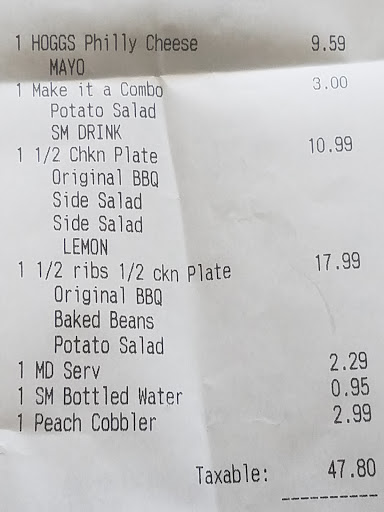 Bad,Bad,Bad. Horrible, IF I had Hogs I wouldnt have the heart to take them there to eat.The so called Hoggs slaw went right to the trash after the first bite. Thank God I was smart enough to get extra barbecue sauce for the sandwiches, or the Tri-tip and pulled pork sandwiches would not have been edible. The so called peach cobbler was dryer than dry and I think I found two peaches in it.The only thing I did right was to only order half a rack of baby back ribs, I dont know what they put on them ,but they were disgusting.. I have never reviewed any restaurant in my life,but I felt this was necessary, If I could just stop one person from wasting there hard earned money on this place. then it was worth my time.My wife seldom ever agrees with me on anything, but shes 100% with me on this one.