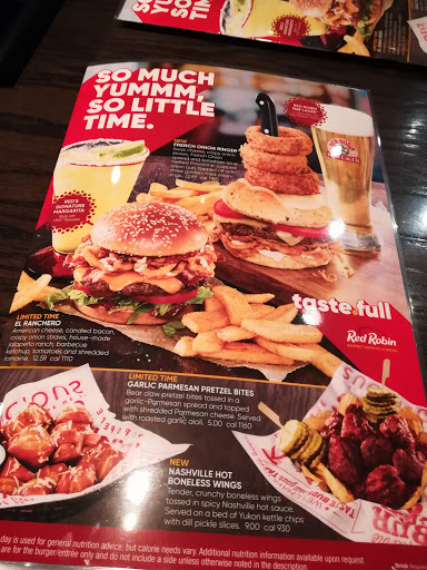 Terrible. Very long wait for appetizers and when they arrived the fried mozzarella sticks were cold inside. Our server did not come by for another ten minutes and by then she said our food was next so we told her not to bring another order but then our food ended up taking another 10-15 minutes after that. We ordered Mac n cheese for our two kids-one order came in a soup style bowl with a handle piping hot and the other came on a large plate and looked like it was half eaten. The pasta was all shifted to one side like someone had been eating it and there was cheese smears on the side of the plate. We asked to send it back-I cant believe anyone in the kitchen or our server would think a plate looking like that would be acceptable. Our servers first response was to tell me that we had free refills on the Mac and cheese! As if getting more would somehow make up for a dirty plate that looked like someone had been eating out of it! It took another 5-10 minutes to get a replacement. When the check came, they had charged us for the undercooked mozzarella sticks. The place is dirty, they staff seems snarky and careless. Ill never go back and wont likely visit any other Red Robins again.