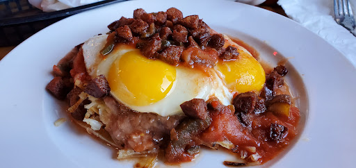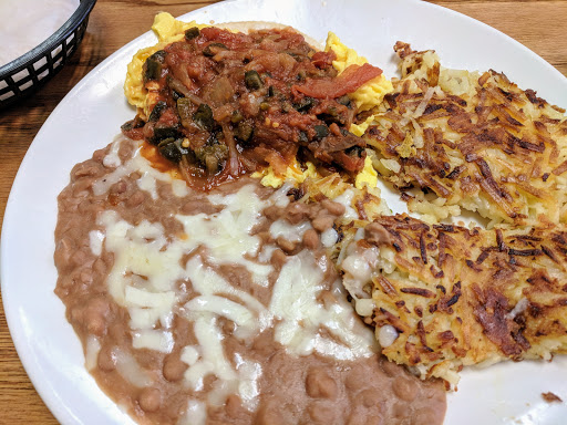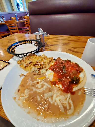 3.5 stars, rounded up. Good: - Easy parking - Prompt and friendly service - A lot of regulars and restaurant staffers who warmly greeted them by name - A large variety of dishes to choose from - Food wasnt unduly heavy or greasy Okay: - Pricing tended mildly towards the high end for a straightforward comfort-food diner, but probably about what one would expect for Silicon Valley. $20 after tax/tip for a modest breakfast. - Presentation: The beans were nearly overflowing from my plate. - Atmosphere: Not too loud, reasonably comfortable. I had the chilaquiles plate: corn chips topped with two eggs (any style), with a generous portion of homefries and beans on the side. The chilaquiles were a bit too spicy for my liking, but perhaps Im just accustomed to the bland-wimp-guy version sans chiles and such. The potatoes seemed a little undercooked; I prefer mine crispier. But these were still flavorful. And the refried beans, er, how can you go wrong there? The coffee was fine (better than usual diner quality) and the fresh-squeezed OJ was quite refreshing. Will I be back? Probably. Im hankering to try their fruit pancakes or french toast next time; Ive heard especially great things about their banana pancakes :).