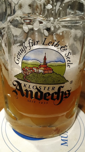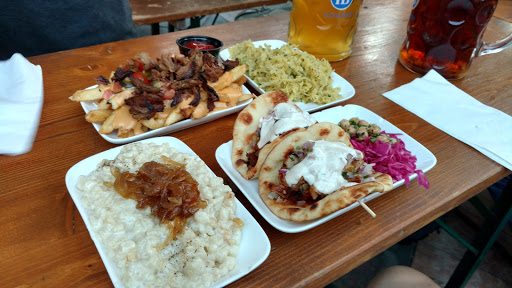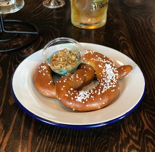 I couldnt give less than 5 stars to any place outside of Bavaria that serves my favorite beer ever: Andechs! And its cool that theres a biergarten feel to it, and theyre super dog friendly--our puppy got lots of attention. The food was less good than the beer, though. Its OK pub food. We had the mustard chicken sandwich (good) and the pretzel melt (not good: soggy and too spicy). I would have preferred more traditional beer garden food: obatzda, roasted chicken, pretzels, weisswurst. That said, I would definitely go again just for the beer!