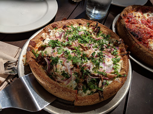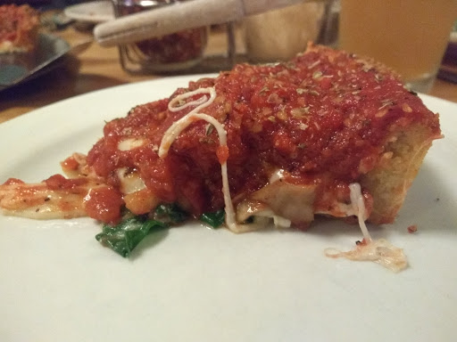 Outstanding! I ordered what I learned was secretly named "The Brass Monkey" version of stuffed pizza; basically "The Blue Line" (or "Little Star") -- spinach blended with ricotta & feta, mushrooms, onions, garlic -- with Italian sausage added. Everything was just 100% spot on. Perfect combo of awesome crust and sauce and cheese and mixins. In particular, a nice tanginess to the sauce, and fresh garlic that complemented rather than overpowered the pizza. And the service was excellent as well. Our server was engaging and friendly and helpful without being over the top or obtrusive. Water was refilled promptly, used dishes were cleared away quickly, and so on. Oh, and the dessert with gelato and a chocolate chip cookie was really yummy, too! Anyway, I cant wait to go back. This place easily beats Patxis in nearly every way. Or maybe Ill just make myself fatter (and happy!) and order the same Brass Monkey again to go for a weekend of delicious eating.