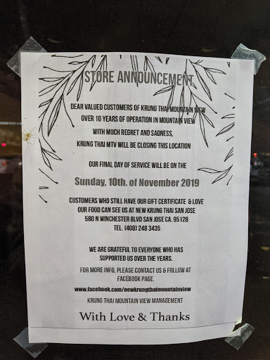 In A Nutshell: -As I sit here writing this review, beads of sweat are slowly dripping down my forehead and the waiter continually replenishes my glass of water. -Americans are in love w/ Thai food. -I decided to try something different and ordered the Pad Prik Nhaw Mai (Bamboo Shoot & Green Pepper). -The bamboo shoots were better than I thought theyd be: tender & soft. I wish the ground chicken was a little more plentiful, but no problem. The medium spice was just enough to cause bullet point one above. Overall, Krung Thai is a small Bay Area family of restaurants and this is their Mountain View/Palo Alto/Los Altos locale. Delish as always.