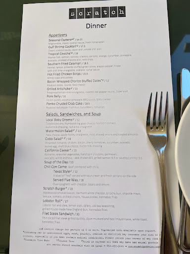 What I like about Scratch are the booth tables. The menus are difficult to read because the font is small and the restaurant lighting is dim. The restaurant is not as loud as many others in Downtown Mountain View. I will never order the lobster roll again. I am used to the one at Sams Chowder-house (served hot with drawn butter) and the one at Scratch was very small, cold and smothered in mayonnaise. They can be a little weird about substitutions for allergies and suggested that I call ahead, however I am often a spontaneous eater. The food is pricey for what you get. You have to ask for salt and pepper if you find you need it, which I do not like because I dont know that I need it until I have tasted my food and then it takes time to get it from the server and my food gets cold. Oh, sometimes the menus are misleading. On one dish it said it came with "deep fried waffle-cut potatoes" which turned out to be two potato chips. The menu description might sound like you are getting a little salad when you get two decorative leaves of fancy lettuce. They really should call these things a garnish rather than making it sound like they are a side.