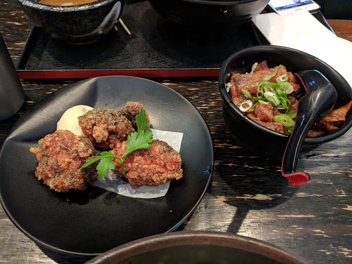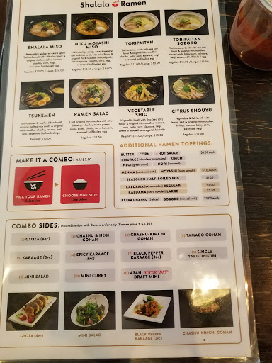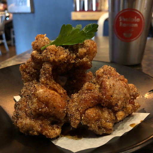 Service - Polite staff. - About 10 min wait when you order for take out - ramen and karage Ambiance - Theres wait for lunch sitting at 1pm on a sunday (maybe because its mothers day?). - Looks like shared tables. Food - I got the Shalala Miso - Broth - nice, thick miso flavor with a slight spicy taste Noodles - medium thickness and nice and chewy The soft egg is good. There was no nori, probably because it would get all soggy in a carry out container. There is also egg, scallion and sliced tree ear fungus. - Black pepper karage - still fairly crispy despite my ordering take out. There is black pepper visibly on it, but it doesnt have a strong black pepper flavor. It also has a slightly sweet sauce drizzled on it. Its seasoned with sesame seeds, and has a lemon and Japanese mayo on the side. Good, but Id probably try the regular karate next time to compare.