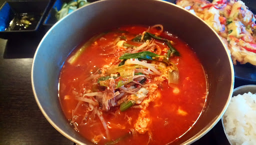 I tried yukgaejang for the first time because so many people recommended it in the reviews. It was good, but I thought the broth was rather bland. I mean the broth was not good enough for me to finish the broth after I was done with the "solid" part of the noodle soup, if you know what I mean. But maybe Im just not able to appreciate it because Im not used to the flavor. I think my favorite Korean soup is still sundubu jjigae though, but I havent tried it at this restaurant. Other than that, the banchan were good, service was okay, and the place was clean.