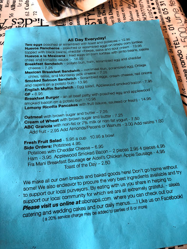 Weve been going to ABC for over 20 years - and its always been a pleasure. We do miss the music that used to be there, and the prices have cllimbed a bit, but they have everywhere, right? Go there! Youll love the breakfast sandwich, the huevos rancheros, the soups, the sammys, and dont forget the awesome aray of desserts. Deal alert: the half-foccacia sandwich with soup and salad. Still around $10. Thanks Alexis - Youre a neighborhood treasure! - Michael and Laurie