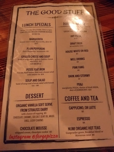 Went in for date night with the boyfriend the other day on a Saturday night , he asked if we needed reservations and i mistakenly said no. We waited a bit to be seated and didnt get the best seat but our waitress completely made up for it. Very personable and efficient. Her boyfriend is the chef i think and she had long thick hair. amazing food. Our hungry butts got a salad, appetizer, and a pizza each. Everything tastes superb. Kitchen banged it out really quick for how busy they were. Going in for happy hour tonight. Tried to call like 3 times before they answered and asked if they were busy and they said no. Asked for reservations and they said ok but never took our names. The hostess staff sucks a little but they all look like first job employees so im not letting that effect how great of a rating forge deserves.
