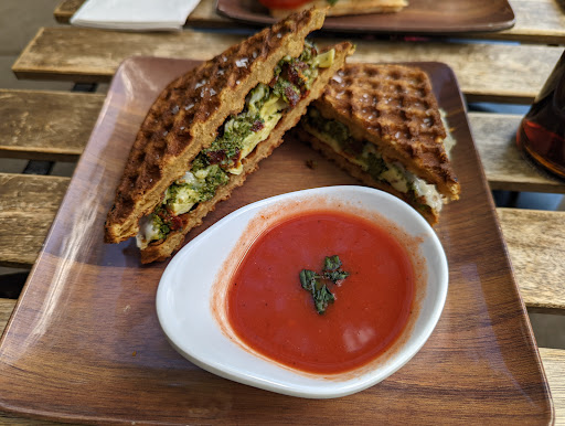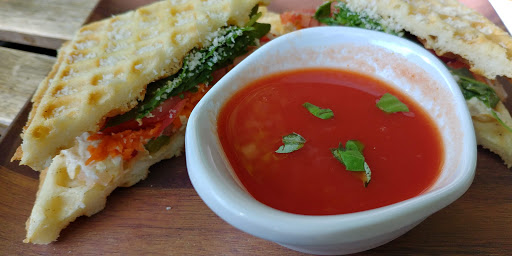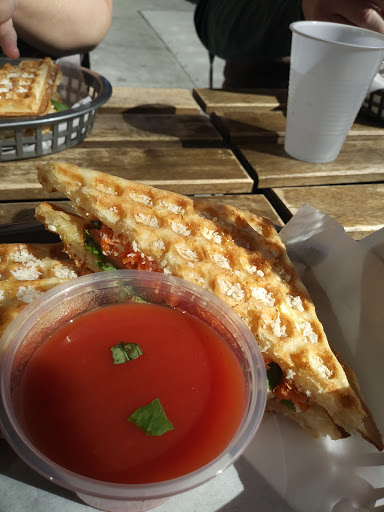 The first steps in and you feel it has a different vibe than any other "comfort grilled cheese place" place you have ever been before. Fast service from order time to getting the food. Reasonable prices especially for the very filling portions! Staff is awesome even during peak hours. "Settin the woods on fire" was what I had. It was delicious. Fresh thick tomatoes. Plenty of avocado in it! The perfect amount of spice. When you just bite into the sandwich as is, its good. Pair it with the tomato soup that they give you a little sauce cup of and it is divine! At first glance you might think it is small, but trust me they have the size down to a science that you can dip every bite to the very last bite! The rose lemonade is something to try out too! This place is a must go for all! They have vegetarian and even vegan options so if you think cheese or dairy will get in your way, they have you covered too!! Did I mention they serve it using waffles? Amazing combo!