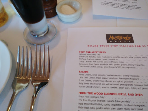 Im pretty torn about Mustards Grill. On one hand, it is one of the highly rated and recommended restaurants in Napa, and on the other I had a very polarizing experience, so Im not sure exactly where I land. Maybe I just need to go back and give it a second chance... THE GOOD Variety. There is an awesome variety of dishes and ingredients to choose from. There will be something for even the pickiest palates. Theres meat (several different types), seafood, veggies, light, heavy, acidic, salty, you name it. Also Mustards prides itself in fresh and homegrown ingredients (as you can tell from its garden in the back) so you know youre getting the good stuff. Mushroom Tamale. Very simple -- just corn masa, mushrooms, cilantro, sunflower seeds, with a wonderful green sauce. Light, refreshing, and a great way to start the meal. Rabbit. Cooked perfectly so that its not very gamey, great accompaniments. Our server was very nice and beared with us during our very indecisive process of choosing a glass of wine for the meal. Actually, props to the entire staff for being very nice and courteous through the entire meal. THE BAD / ENIGMATIC We also ordered the lamb, which came two ways, the loin and the chop. It was definitely undercooked because I could barely cut through it because of the connective tissues. It even looked raw. When I told our server, she was very apologetic and admitted right away that it was not cooked properly. She took the dish away promptly. The manager was the one to come back and was very apologetic. I appreciated that. They definitely tried to deal with the situation with grace. But the interaction was very weird. For example, he asked me whether I wanted a whole new dish or for them to put the meat back on the grill. Well, we already split the dish up into two parts and the entire thing was a mish mash of the meat and veggies. So I didnt even think it made sense to offer the latter option. If youre gonna give an option, ask if the customer wants a whole different dish. In any case, I asked to have them prepare a new one. When it came back, he wanted to make sure it was made to the way I wanted. While I appreciate this, I really just wanted to be cooked exactly medium rare. His exact words were (paraphrased I guess), "is it made the way you want or do you want to cook it a little more?" That leads me to think that they dont know how to cook lamb medium rare. I was very confused by this. In any case, I decided to keep it and it was fine. The meat was very good and I liked all the veggies it came with. We decided to end the meal with the famous meringue pie. I dont know if this is just my bad luck or whatever, but I found a bug in it :( Im sure they didnt put it there intentionally or that the restaurant has too many bugs flying around. I think maybe the bug was attracted to the candle or the meringue and just got stuck. I dont know but it was weird and definitely added insult to injury. Objectively, Mustards Grill is a very good restaurant, if everything were executed properly, which Im sure 99% of the time it is. If I come back, I definitely want to try the pork chop since its the most popular item on the menu (judging by pictures).