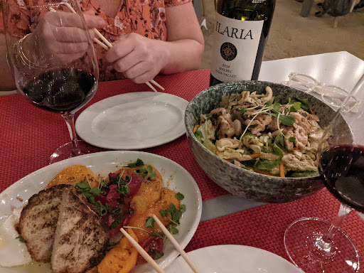 Service was great. The reason I am only giving three stars is simple, two of the dish preparations were the worst I have seen in Napa. Unless you are a starving rabbit. I ordered two appetizers,the crab cakes were very good and well presented with a spice Aolie sauce . But the fried calamari was a the first of two dishes that I had major issues with. The plate was literally a mountain of shredded raw cabbage slaw with no calamari in sight. I am not exaggerating here. I needed to use my bread plate to clear it off the Squid.This dish could have been better if the roles were reversed,calamari on TOP of a light bed of cabbage could have worked. Now sometimes when you order in a restaurant you have never been to you hit it right and other times you fail well both my wife and son failed. They ordered the Coho Salmon tostadas. Ok when in California you think any Mexican style food is going to rock. When the two dishes came out we were all in disbelief. The plate was duplicate of the Calamari but using purple Cabbage. The food itself was no where in sight. I watched the two of them shovel the cabbage to there bread plates to start the search for there entree. Underneath was a soggy tostada with black beans and fish on top. Ironically as we watched the other entrees go to other tables they looked amazing. My dish the Halibut special with fresh beets was fantastic. Next visit we will stick to there go to dishes. I hope this review finds the chef.